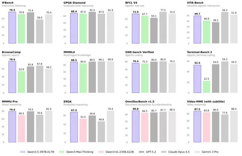 Результаты Qwen3.5-397B-A17B в сравнении с конкурентами (не все модели тестировались на всех бенчмарках):